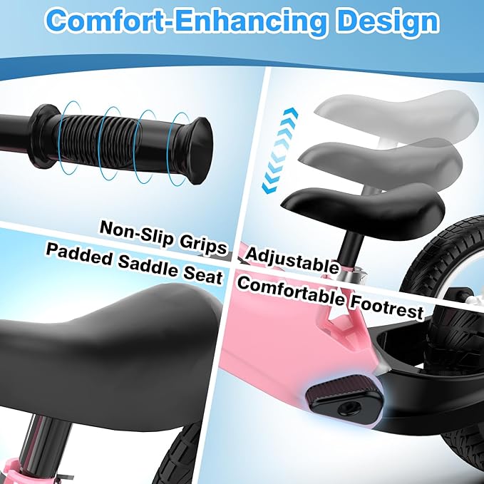 - 【THOUGHTFUL DESIGN FOR COMFORT】Featuring an adjustable seat height (12.2"–16.9") to grow with your child, a soft padded saddle, a rest footrest, and non-slip handlebars for enhanced control and comfort. Silicone shock-absorbing strips at the frame joints further improve riding stability.