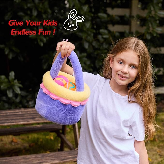 8 Piece Plush Stuffed Playset Toys with 7 Eggs, 1 Furry Bag, Soft Basket Set Sensory Toys for Girls Kids Ages 3+, Birthday Christmas Valentines Easter Party Favors Gifts