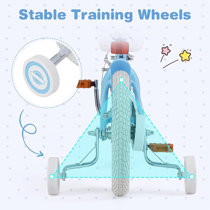 - [ Specially Designed for Young Riders ]: Featuring stylish outlook and stable training wheels, this bike for kids is sure to be a perfect gift for beginners to learn to ride. The bike seat and handlebar are height adjustable, suitable for growing kids. Apart from that, it also comes with a cute basket to fulfill kids’ storage requirements, adding more fun to their riding.