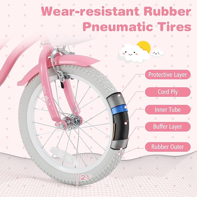 - [ Durable & Comfy Design ]: The wear-resistant pneumatic tires are made of multi-layer materials: rubber outer, buffer layer, cord ply, inner tube and protective layer, offering a safe and steady riding experience. The sturdy carbon steel frame provides long-term use and makes the kids bike easy to ride. What’s more, the PP covered seat improves the overall comfort.