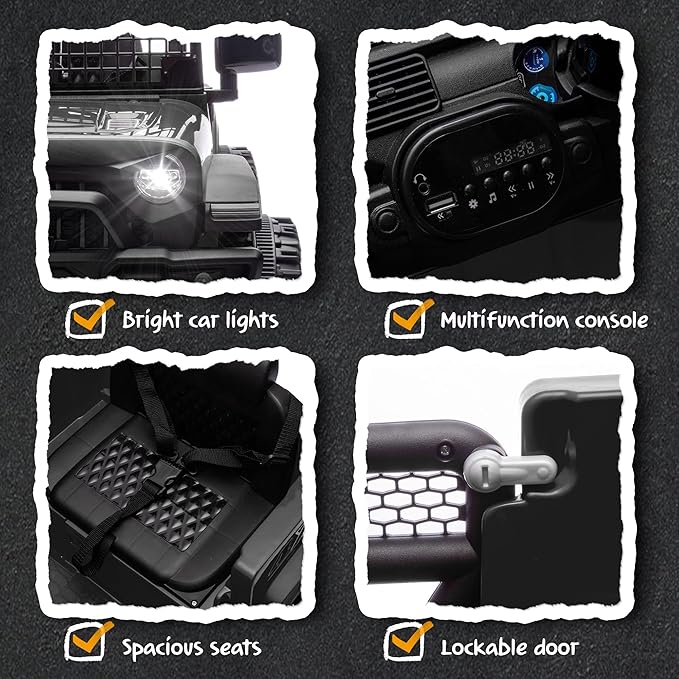 - Multifunctional Dashboard: Our electric jeep car features a one-button start for easy operation, giving kids a real driving experience. The MP3 player, Bluetooth, and bright LED lights allow you to play your child's favorite music or stories, making every ride fun and entertaining!