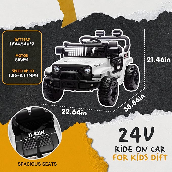 - Powerful Performance: This ride on Jeep is equipped with a robust 24V 4.5AH battery and a 200W motor, offering faster speeds for kids who love adventure. It's one of the most popular 24V ride-on cars on the market, perfect for young thrill-seekers!