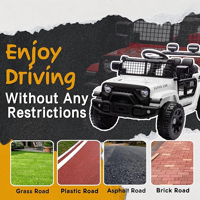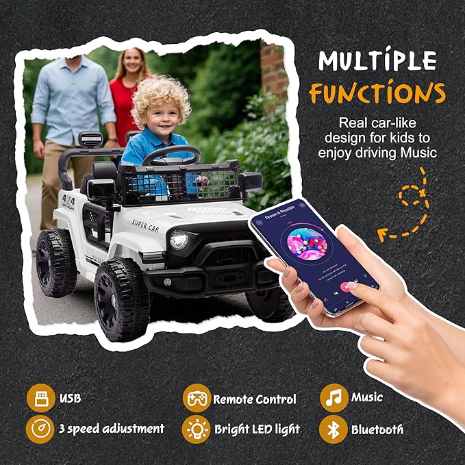 - Multifunctional Dashboard: Our electric jeep car features a one-button start for easy operation, giving kids a real driving experience. The MP3 player, Bluetooth, and bright LED lights allow you to play your child's favorite music or stories, making every ride fun and entertaining!
