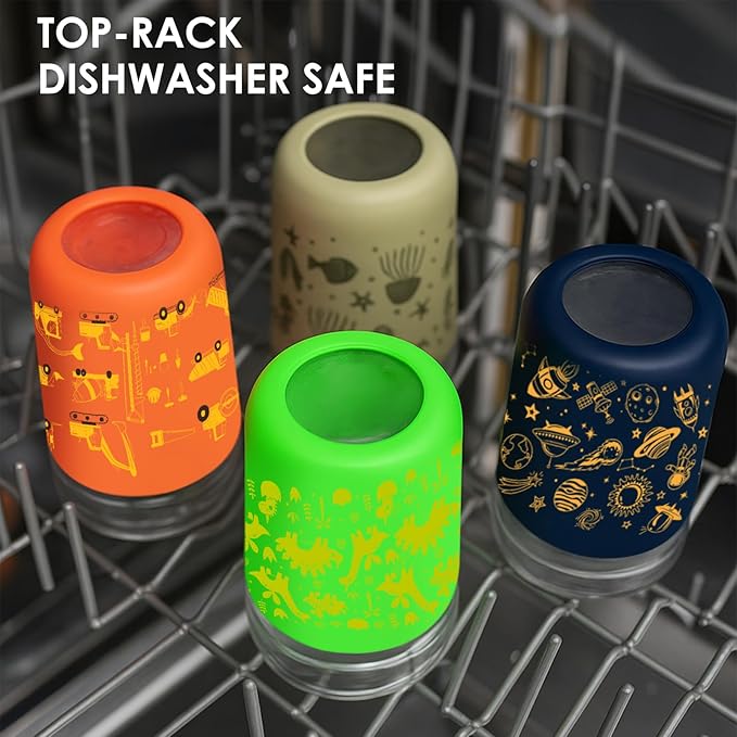 - Colorful Non-Slip Design for On-the-Go Fun:Vibrant, food-grade silicone sleeves with playful patterns offer a secure, ergonomic grip for tiny hands. The sleeves also insulate against hot/cold surfaces to protect little fingers. Use as versatile snack jars for yogurt, berries, or cereal—perfect for picnics, daycare, or travel.