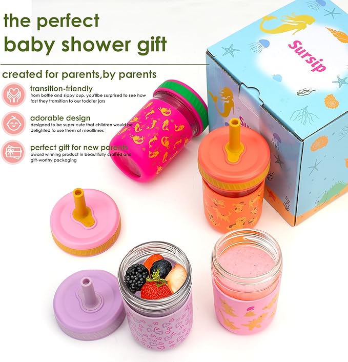 Sursip Toddler Glass Cups with Straw, Spill-Proof Kids Mason Jar Food Storage with Lids, Sippy Cups for Drinks, Smoothies, Snacks, Milk Cup [4 Pack] 8 oz 2-in-1