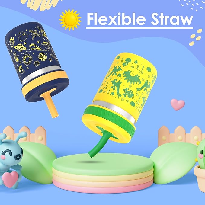 - 3. Spill-Resistant and Kid-Friendly Design: The silicone straw lid is splash-resistant, preventing messes when the cup is tipped over. The threaded lid stays securely attached, even if kids hold the cup by its spout. The compact 10 oz size and soft silicone sleeve, printed with adorable patterns, are designed for small hands, making it ideal for use at home, in the car, or during outdoor adventures like camping or picnics.
