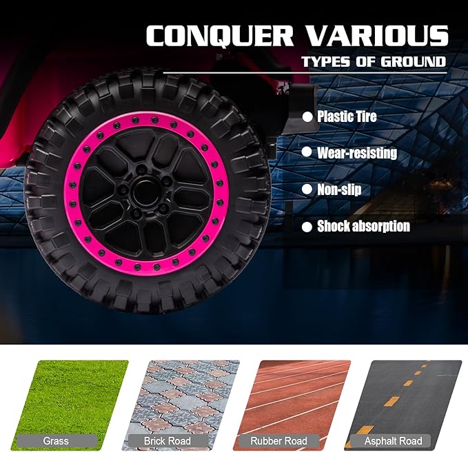 - High-Performance Ride on Car: When the ride on car starts, the soft start system will work to avoid the risk of sudden cceleration or braking. The 4 wear-resistant anti-skid non-plastic wheels with spring suspension can provide a smooth driving on different terrains such as grass, brick road, asphalt and so on. Dimension: 39.7in*25.5in*24in (101*65*61cm), load capacity: 66lbs. Speed: 1.9-3.7mph