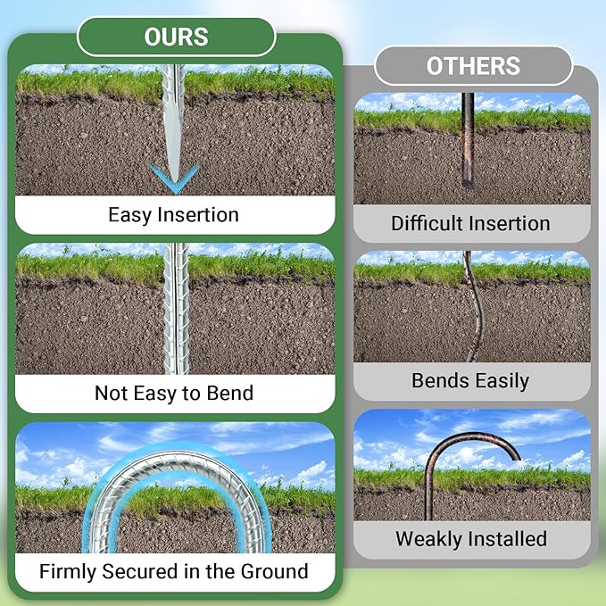 - Versatile Outdoor Use: These ground stakes are ideal for various outdoor activities, including gardening, camping, and yard work. Whether used as heavy-duty trampoline stakes, swing ground stakes, soccer goal stakes, chain-link fence stakes, or for securing camping tents, they provide reliable support.