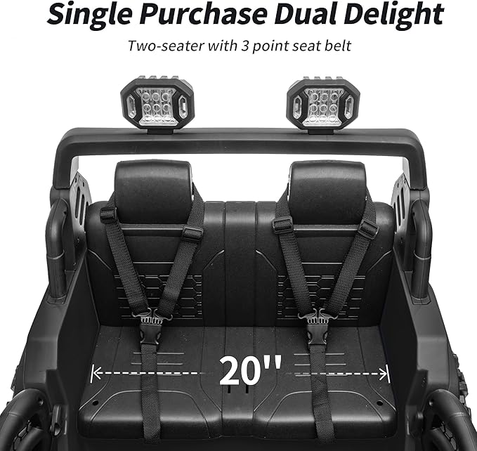 - 20" 2-Seater Design: This 2 seater ride on car with remote control features a genuine 2-seater design, equipped with spacious 20" seats. This 12V ride on truck provides kids with comfortable and roomy seating space, delivering a joyful companionship experience for siblings or friends.