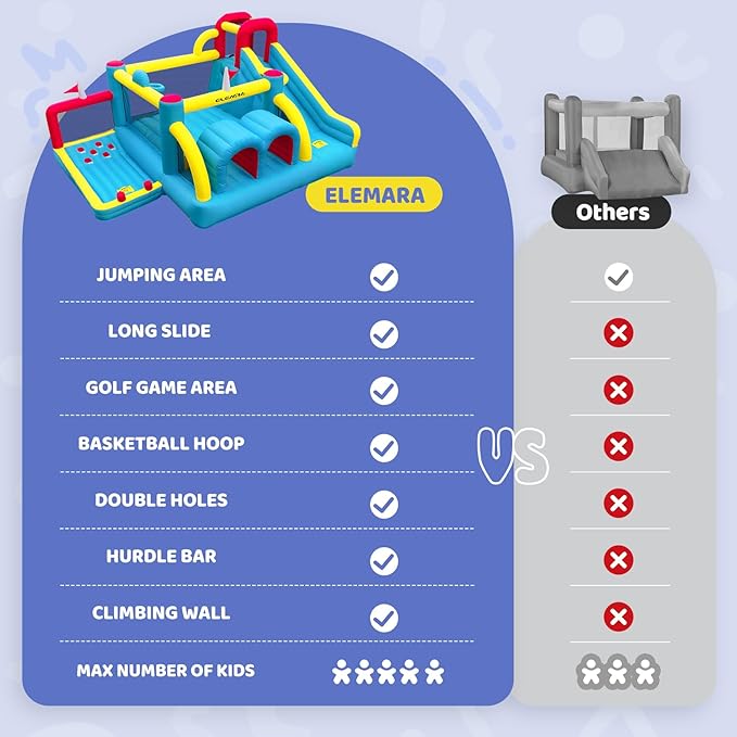 - 7 in 1 Big Bounce House For 6 Kids: This XL Bouncy Castle not only has classic features like the bouncer; climbing wall; basketball hoop; the long slide; obstacle courses and double tunnels but the golf area take the game to the next level. There is large enough for two kids to golf competition. Swing the ball into the pit with the included golf club and your kids will have a great sense of achievement! This Inflatable Bouncer spans nearly 12 x 15x 6’, and holds six Kids