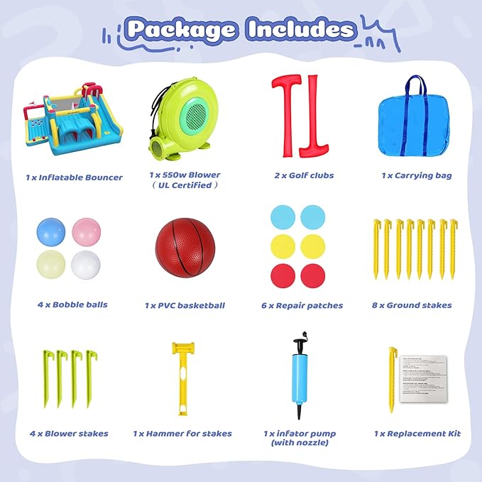 - Multiple Safty Protection: Kids safety is our priority! The safety net inside the jumping area ensures safety while allowing parents to observe the child's condition at all times when the child jumps. The 14.2'' Higher guardrails of the slides further enhance security. Besides, there are ground stakes and four blower stakes to fix the bouncy house and blower for higher stability.