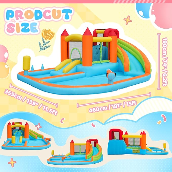 - WARM ACCESSORIES:Include a heavy duty blower-450W, repair kits,carry bag,bouncer stakes,ring toss,blower stake,basketball,Air Pump,Water Gun,hammerare(not including the ocean balls)