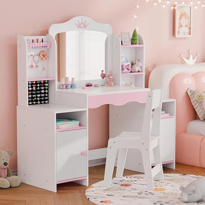 - Durable & Child-Safe: Built with high-quality MDF and reinforced legs, this girls vanity and stool set is strong, stable, and made to last. Rounded corners and easy-to-hold handles enhance safety, making it a secure choice for young children.