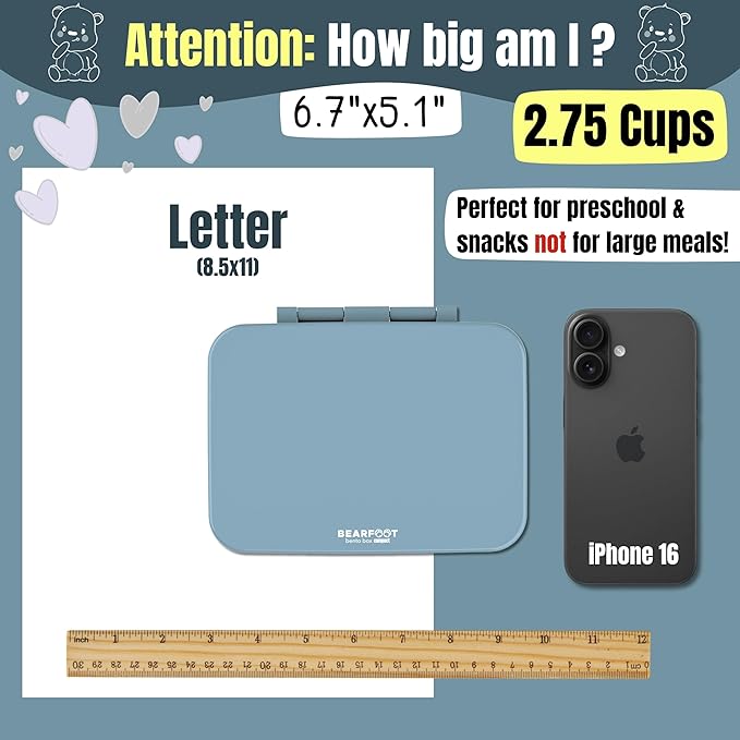 BEARFOOT Kids Lunch Box with Compartments – Compact & Lightweight | Leak-Proof, BPA-Free, Dishwasher & Microwave Safe | Hand-Drawn Design for Preschool, School, Travel (Blue, 2.75 Cups)