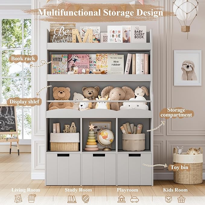 HITHOS 55.3" H Kids Bookshelf with Toy Storage Organizer, Tall Book Shelf with 3 Movable Toy Storage Bins, Large Kids Bookcase with Toy Chest, 39.2" W Modern Toys Box for Kid Room, Playroom, Gray
