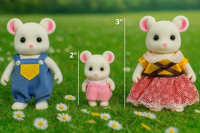 - WHAT'S INCLUDED: Three white mouse figures (two parents, one mouse pup). Removable outfits included; accessories not included. Ready for play right away
