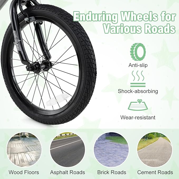 - More Considerate Features: With metal frame, the bike is strong enough to withstand multiple bumps. The wear-resistant and shock-absorbing tires offer young riders a steady riding experience, while ergonomic seat enables kids to sit with comfort. The front and rear reflectors keep kids visible in low-light conditions. Meanwhile, the 18” bikes are equipped with an extra kickstand for parking.