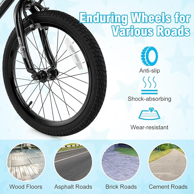 - More Considerate Features: With metal frame, the bike is strong enough to withstand multiple bumps. The wear-resistant and shock-absorbing tires offer young riders a steady riding experience, while ergonomic seat enables kids to sit with comfort. The front and rear reflectors keep kids visible in low-light conditions. Meanwhile, the 18” bikes are equipped with an extra kickstand for parking.