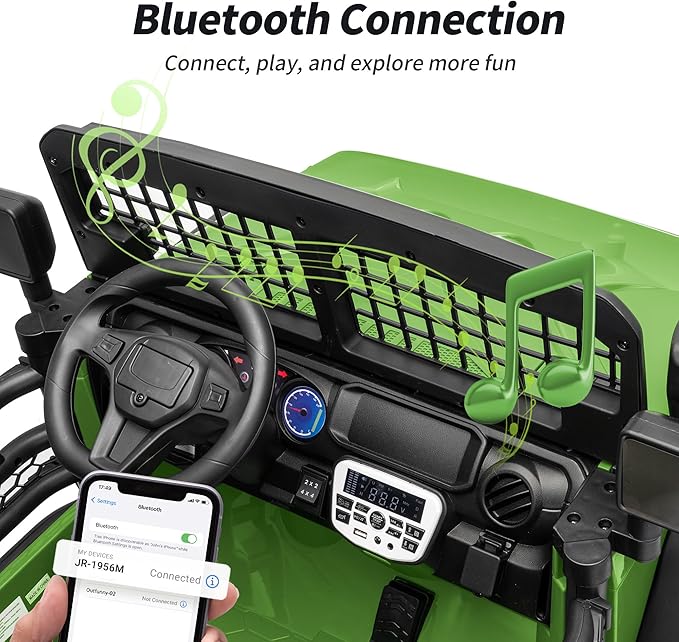 - Realistic Driving Experience: Thrill-seeking kids will love this 24V ride on toy! Packed with realistic features like working headlights, rear searchlights, built-in music player and battery level display, this kids ride on car is built for imaginative outdoor adventures!