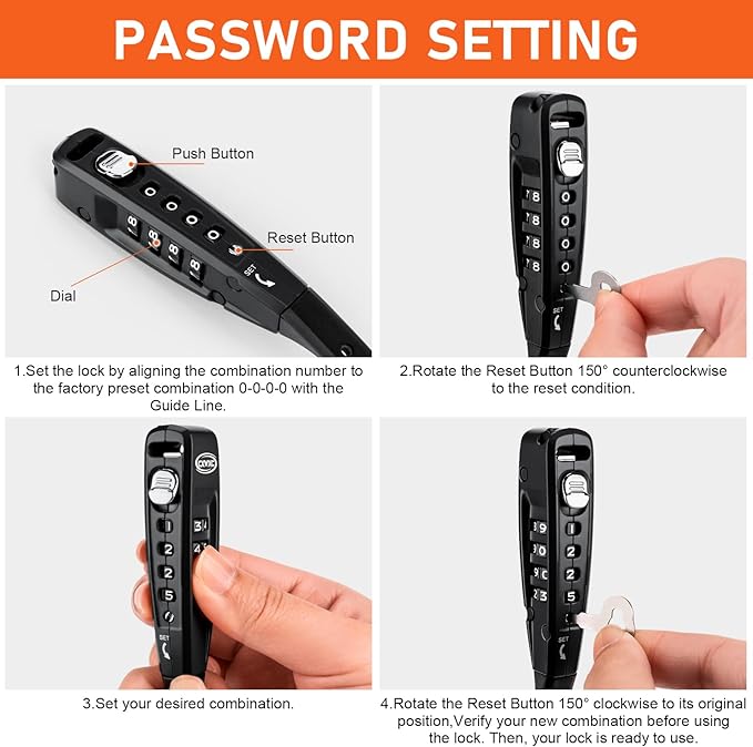 - 【4-Digital Combination Lock】: the Anti-theft cable lock is a steel-core, lightweight security tie lock with resettable combination code. 4-digit resettable combo code allows for up to 10,000 combinations; The Security lock can be opened and closed following the individual setting of a 4 number combination code, which can be adjusted according to requirements.