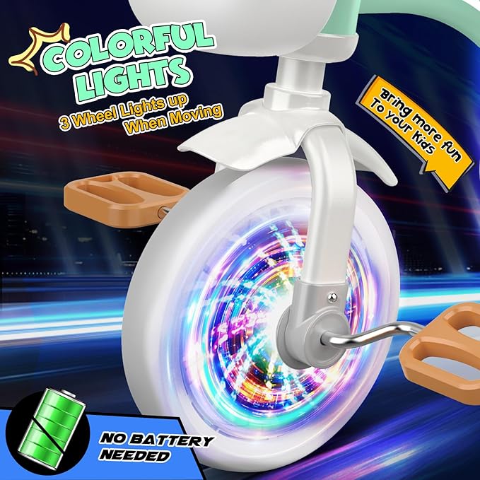 - 🌟【Colorful Lighting Design】: Light up the night, double the fun for your kids! No batteries required, simply spin the wheels to glow. These dazzling lights add an extra layer of excitement to every ride, also improve visibility and increase safety of night rides. Our toddler tricycle is the ideal toys for ages 2-4 kids.