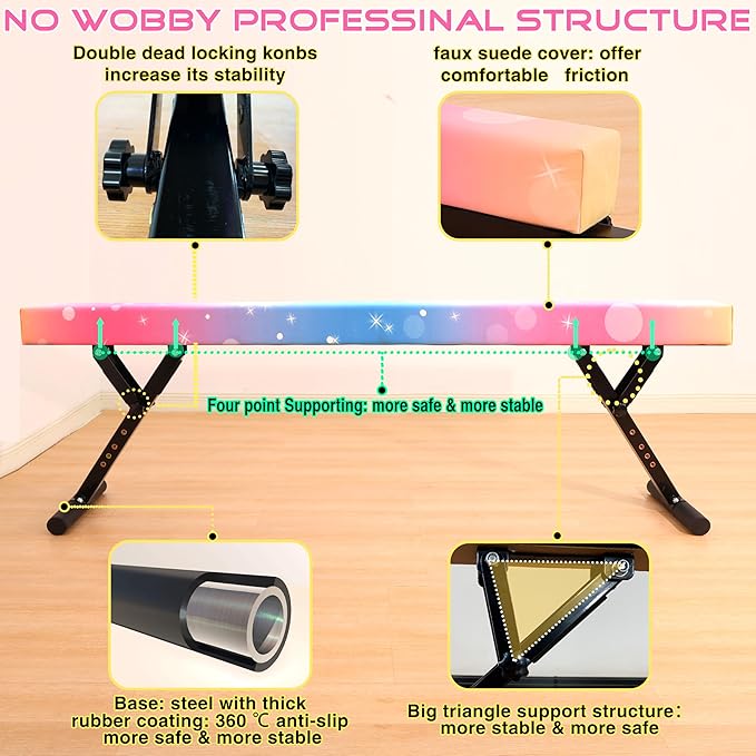 • 360 Degree Anti Slip Beam Leg Bar: our balance beam leg bar is made of stronger steel with thicker rubber coating, the rubber bar offers 360° anti-slip, increase whole stability, give your kids double safety