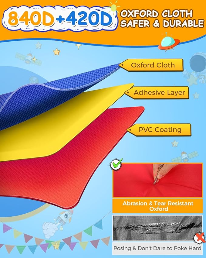 - ✅【Well Constructed and Sturdy】All high-stress areas, including bouncing surface, mattress sides, bottom, and slide surface are industrial strength, made of heavy 840D+420D oxford and well stitched, it held up amazing, rough jumping and flipping it held up with no issues, allow for tall leaps and comfortable landings. It is a great way to let kids burn off energy by setting it up in our basement for icky weather or winter days, and set it up outside in summer or warmer months, can be able to use until kids older. Comes with repair patches and patchlines in case you need to make any repairs