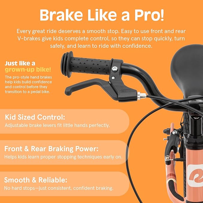 - STOPS ON A DIME Front and rear hand brakes with adjustable levers (easier than a toddler scooter) fit small hands just right, giving your child the stopping power to ride safely every time