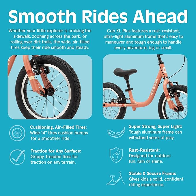- SMOOTH RIDING - Wide 14" air-filled tires grip pavement, grass, or gravel with ease. Your kiddo will cruise comfortably over bumps while learning balance on this balance bike without pedals