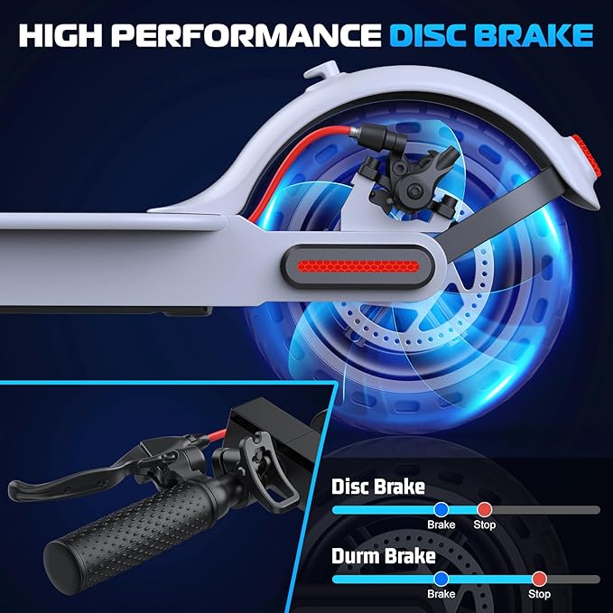 - ✔ Keep You Safe: The Caroma electric scooter adults has auto-lighting headlights for night visibility and safety warning taillights that flash during braking. The dual braking system (EABS anti-lock braking and DISC braking) ensures a quick 0.1S response for your safety. Equipped with 8.5-inch inner honeycomb solid tires, this electric scooter for adults offers superior shock absorption compared to e scooters with solid tires.
