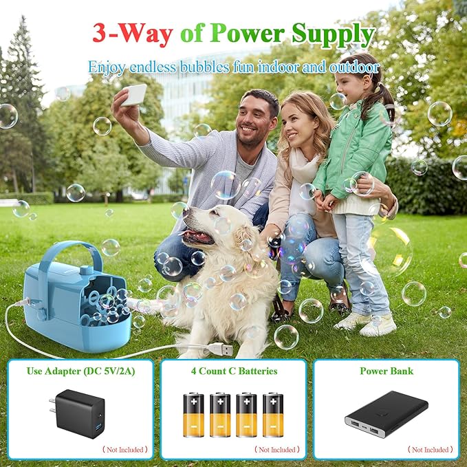 - 【3 Ways of Power Supply, USB Cable or Battery】Bubble Blower Can Be Powered by 4 Count 1.5V C Batteries (Not Included) or Plug In USB Power Cable with Adapter (Not Included), Phone Charger or Power Bank, More Convenient To Use And Enjoy The Bubbles Leisure Time Indoor and Outdoor