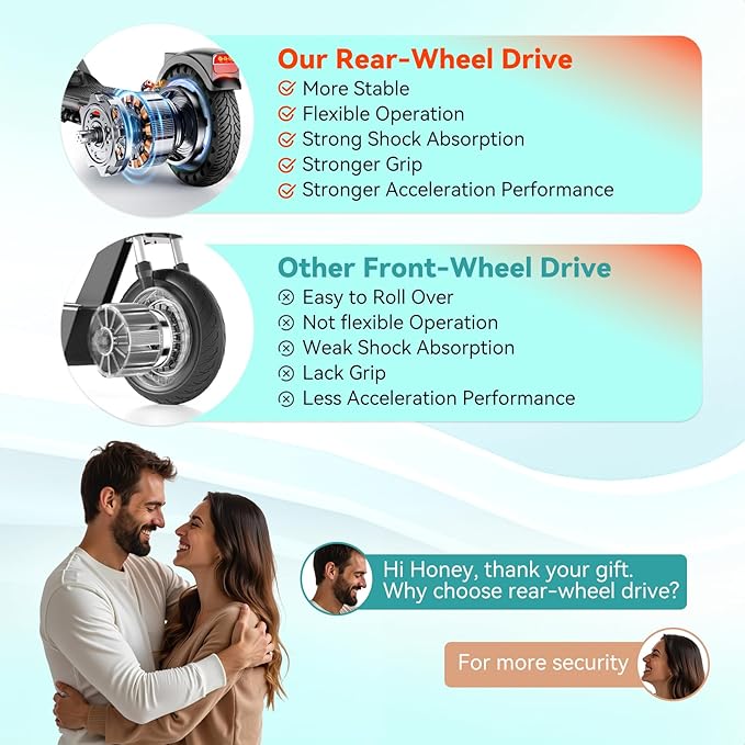 - 【Why Choose Front Wheel Drive?】:Choose our rear-wheel drive electric scooter for a smoother, safer ride! Unlike front-wheel drive, rear-wheel drive provides better traction on hills and slippery roads, reducing wheel spin. It offers greater stability at higher speeds and a more natural, comfortable acceleration. Perfect for city commutes or outdoor adventures, our rear-wheel drive outperforms front-wheel drive in control, reliability, and overall performance.