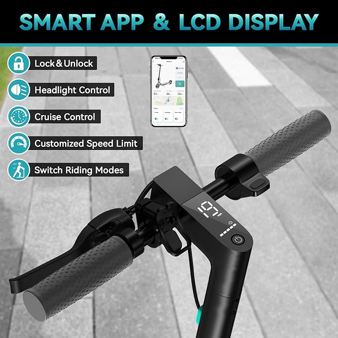 - 【Smart LED Console and APP Control】The scooter electric featuring an intuitive LED display, you can easily monitor speed, mode, distance, battery level, and fault detection during your ride. The scooter for adults also connects with a APP for remote control, allowing you to manage power, locking, cruise control, lights, start mode, driving modes (5 options), fault detection, speed adjustments (3-25 mph), temperature, and auto shut-off.