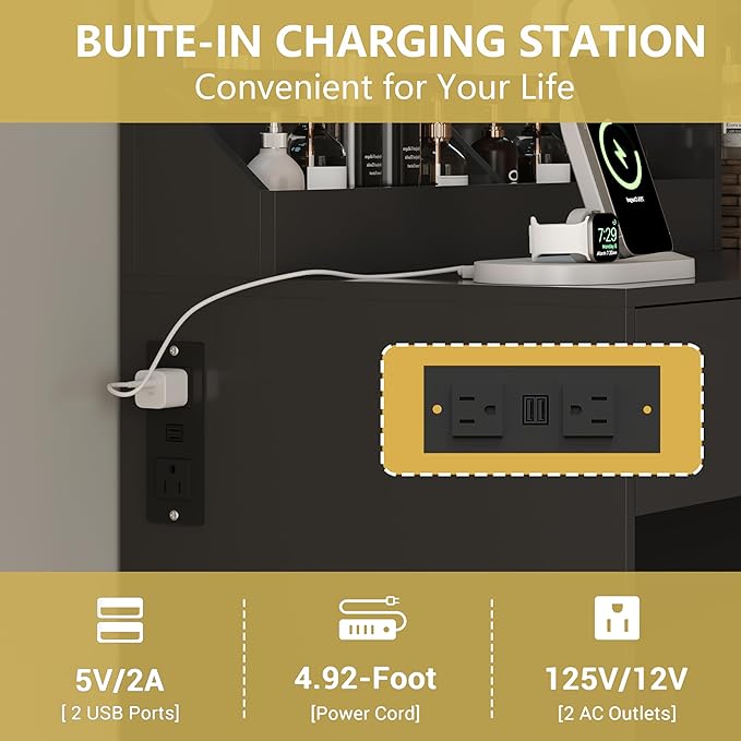 - 【Convenient Charging Station】The vanity mirror with lights desk and chair is equipped with a built-in charging station, including 2 AC outlets and 2 USB ports, allowing you to sit at your makeup vanity and use your hair dryer or curling iron within easy reach and charge your phone, tablet, or other electronics