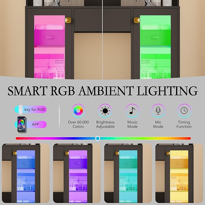 - 【Glass Cabinet with RGB Ambient Light】The cabinet with glass door is equipped with RGB ambient light inside, which can be controlled by mobile app or button. There are more than 60,000 static light colors, multiple dynamic light modes, music mode, microphone mode and timing function. The music mode allows the LED lights to flash to the rhythm of music. Bring you a great visual feast