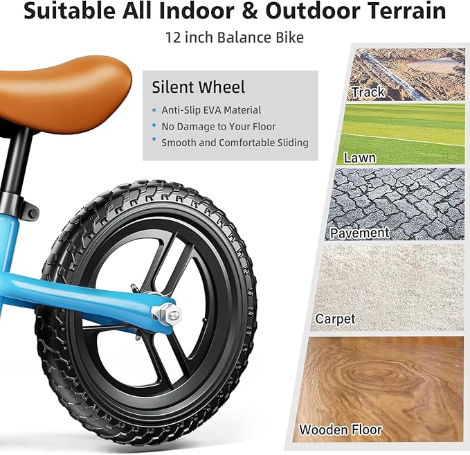 - 12 INCH ALL TERRAIN SILENT WHEEL TIRES - The toddler balance bike toys,it equipped with 12 inch extra-thick silent-wheel tires, make your children safe and stable while ridding. These tires is make of premium anti-slip EVA material, no damage to your floor when rid indoor. It suitable for different terrains, such as grass, sand, wetlands, carpets and so on.