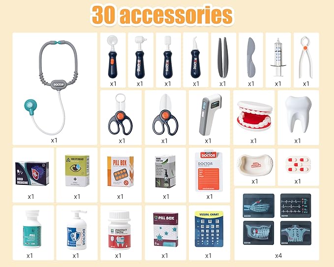 - Immersive Little Doctor Experience: This doctor toy children's set includes 30 or 31 realistic accessories + simulated medical equipment, including a diagnostic light, electrocardiogram machine, dental supplies, nursing supplies, and more. Through light and sound effects, children can transform into little doctors and complete tasks such as pulling teeth, listening to the heart, and giving injections. In addition, all accessories are made of non-toxic materials and are washable, ensuring lasting safety and fun for your future little doctors.