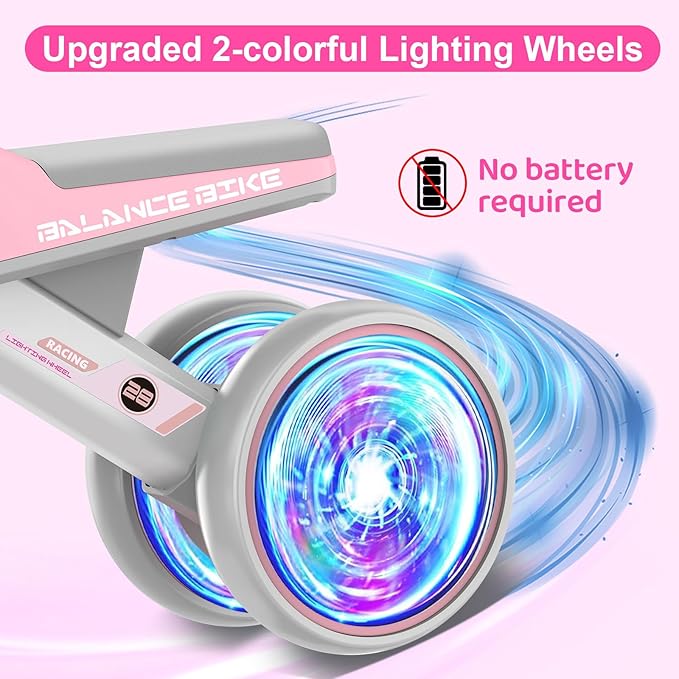 - COLORFUL LIGHTING DESIGN: This 1 year old baby balance bike features vibrant rear wheel lights that glow by friction, no batteries needed. It turns every ride into a fun visual adventure, catching toddlers' attention and adding safety during evening rides, making playtime in the park or driveway even more exciting and magical