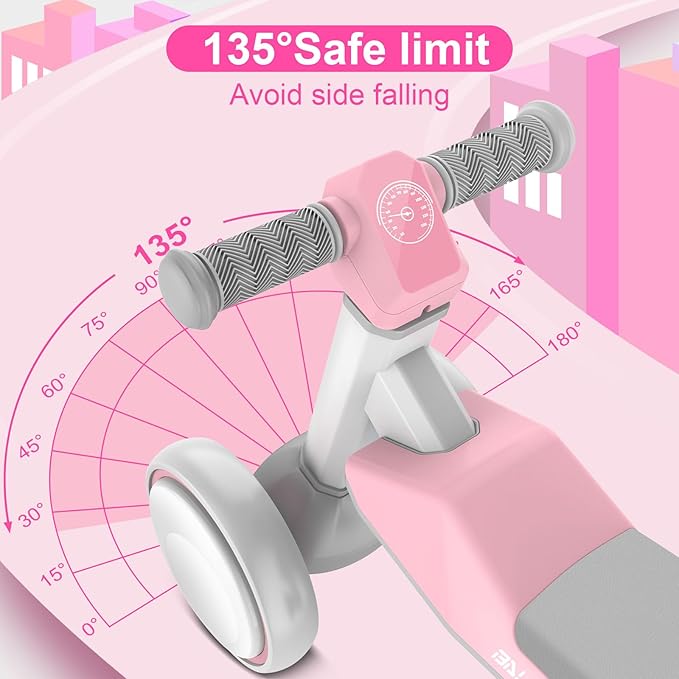 - RIDE SAFELY WITH CONFIDENCE:Built for Baby's First Adventures, this no-pedal montessori toy balance bike for 1 year old features fully enclosed wheels, a 135° steering limit, and a low center of gravity to ensure safe, stable rides. It offers secure support while giving parents peace of mind every step of the way