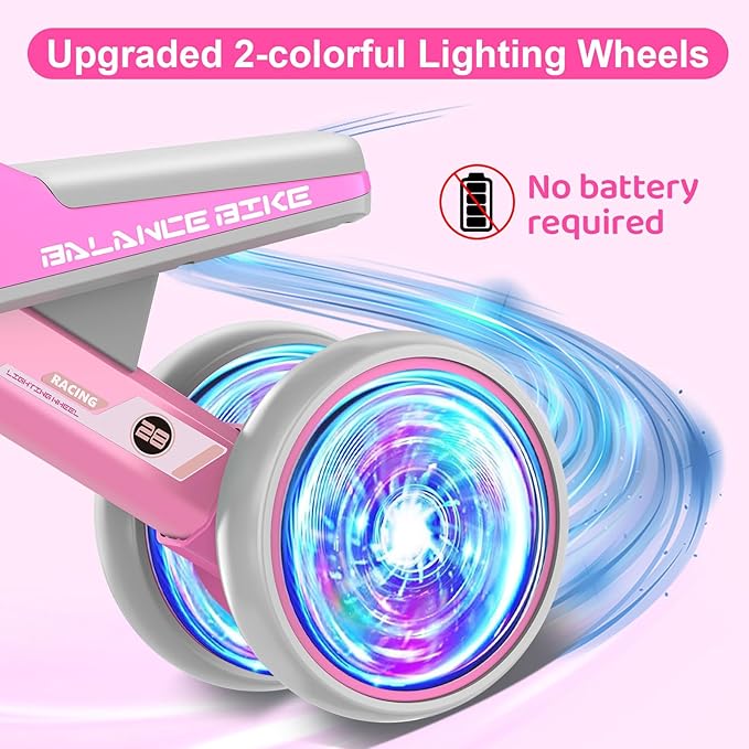 - COLORFUL LIGHTING DESIGN: This baby balance bike for 1 year old features vibrant rear wheel lights that glow by friction, no batteries needed. It turns every ride into a fun visual adventure, catching toddlers' attention and adding safety during evening rides, making playtime in the park or driveway even more exciting and magical