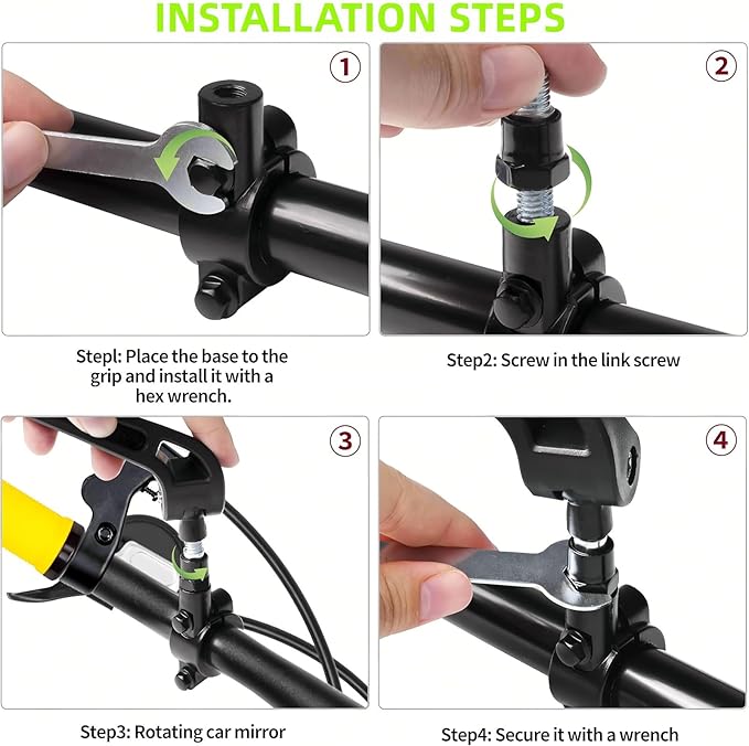 - 【Hassle-Free Installation】This rearview mirror comes with all necessary screws and tools.Simply adjust the base and mirror angles to your preference, then tighten the screws with the provided wrench—no extra tools needed.Enjoy quick, tool-free installation and removal for easy setup on any bike.