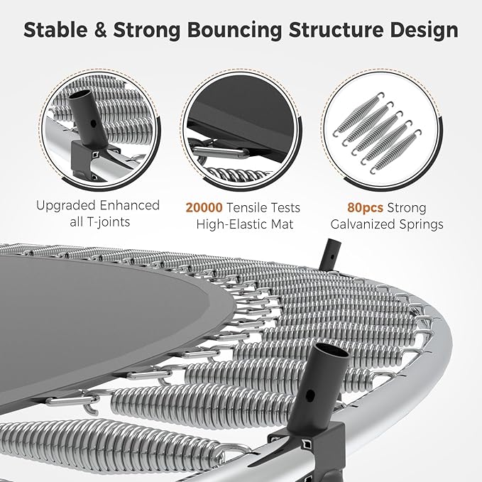 - 【Premium Bouncing Experience】This Tatub large trampoline is supported by 80 robust springs, guaranteeing stability with every bounce. Its heavy-gauge galvanized steel frame forms 4 W-shaped legs with bars, providing a solid foundation for the jumping zone