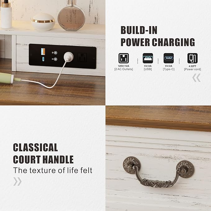 - Built-in Power Outlet & USB Charging Ports: Stay powered up while getting ready! This vanity table with outlets features 2 AC plugs, 1 USB port, and 1 Type-C port, making it easy to charge your phone, plug in a hairdryer, or use beauty tools.