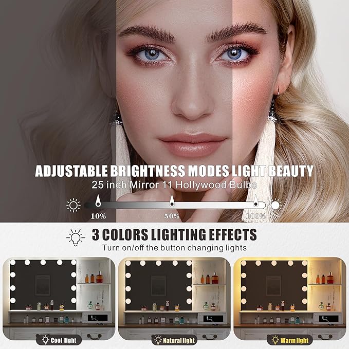 - Hollywood Mirror with 3-Color Dimmable Lights: The large vanity mirror comes with 11 LED bulbs that offer warm yellow, warm white, and cold white lighting—ideal for precise makeup application in any setting.