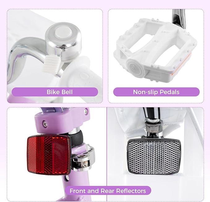- Adorable Basket and Doll Seat: The kids bike features a cute and bright outlook with a beautiful basket, a bike bell, decorative patterns, and colorful ribbons, bringing young riders fun and excitement. Plus, there is a doll seat for kids to bring their favourite toy along the way.