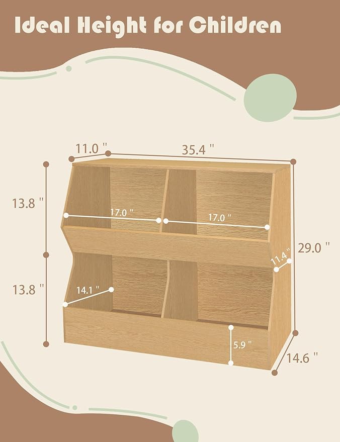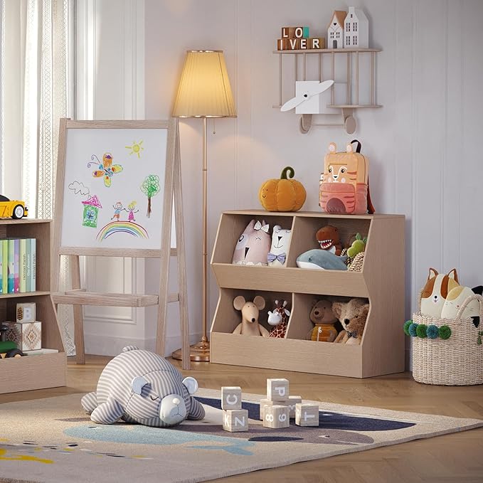 - 【Multifunctional Storage Cabinet】The children's storage unit combines bookshelf and toy storage. 4 open storage bins are spacious for a variety of sizes of dolls, blocks, toy cars, balls, books, staffed animals, etc. The slanted baffle on the upper level prevents items from falling and brings more storage. A flat top brings a stage for picture frames