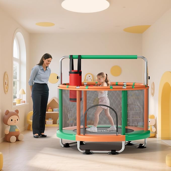 - Complete Protection Design: This kids trampoline atures a sturdy, odor-free, and easy-to-clean safety net. The transparent net allows for full visibility of your child from all angles, ensuring their safety during jumping without concerns about hands or feet getting caught in gaps. Each of the six handlebars is padded with thick foam for soft protection, and the raised circular safety enclosure provides comprehensive security.