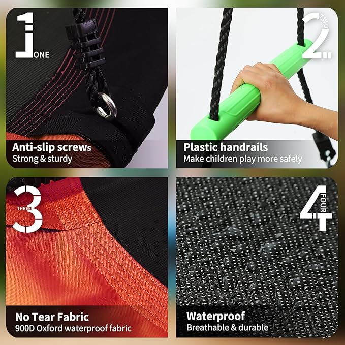 - Versatile: This saucer swing has a fun and engaging for children and adults to outdoors, promoting physical activity, coordination, social interaction in a unique and enjoyable setting