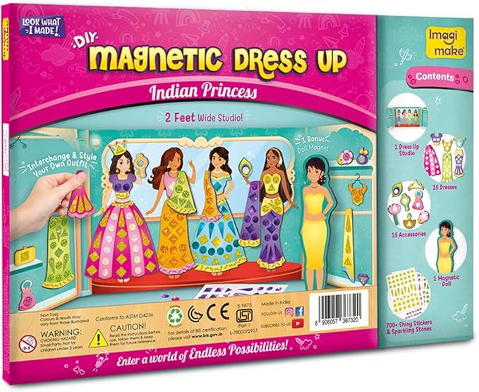 - KIDS FRIENDLY : Imagimake DIY Magnetic Dress-Up Indian Princess set is a must-have for any parent looking to engage their child with fun and safe kids arts and crafts. With non-toxic colors that are ASTM approved, parents can rest easy knowing that their child's safety is ensured while they unleash their creativity with this suncatcher kits for kids.