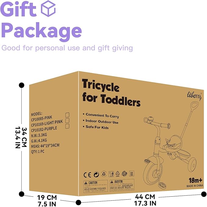 Liberry 2 in 1 Toddler Tricycle Age 2 3 4 Years Old, Kids Trike with Adjustable Push Handle, Bell & Basket, 3 Wheel Bike Riding Toy Birthday for Girls Boys, Purple